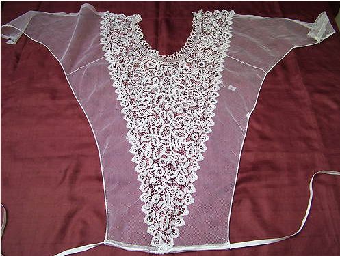 Comments: A Brussels Duchesse bertha, bobbinlace motifs combined with Point de Gaze inserts (no raised work) I think there might be a modification at one end, the two ends don’t match. The bobbinlace motifs are fairly large, and I like the ‘trefoil’ neck edge treatment. Condition looks very good, seller cites a rare bride break, and maybe some pinholes in the needlelace mesh? Not clear.