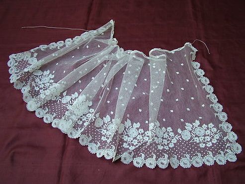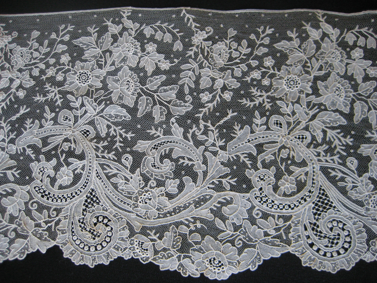 Comments: A wide Point de Gaze flounce, no raised work, with good fillings. It’s quite a nice design, not just the conventional roses. Condition is very good, despite a few small holes. For a piece this size and quality these are minor considerations.