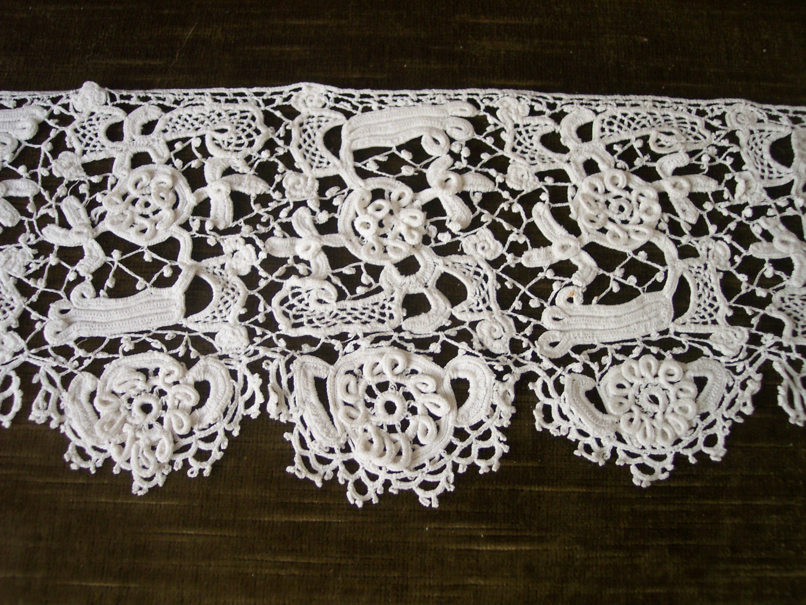 Comments: An interesting length of Irish crochet. Looped raised work forming flowers, and note the Clones knots in the bride structure. A long, collectible piece, in very good condition.