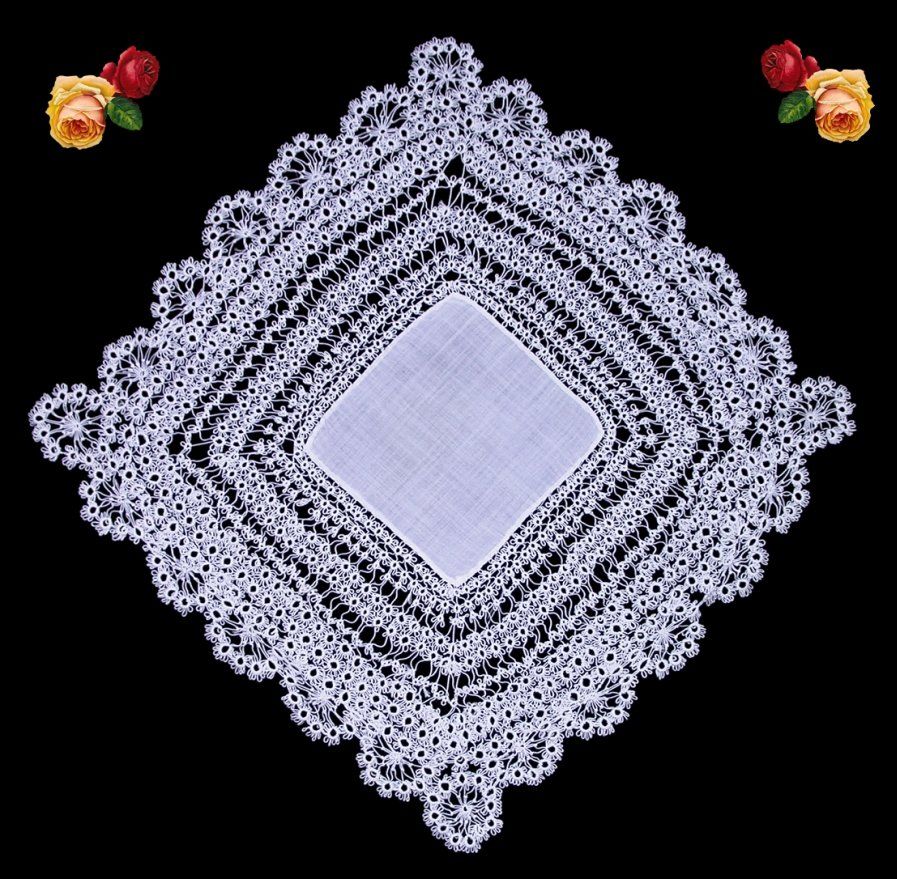 Comments: A tatted handkerchief. Note the motifs tied together, indicating an earlier origin. The rather crowded design gives a very frilly look, do the closeups to appreciate the detail. Condition looks very good, I don’t see any problems from the photos. Seller does state that it has been ‘freshly laundered’.