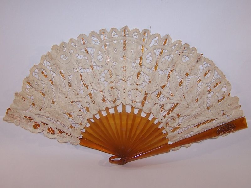 Comments: A Brugges bobbinlace fan with very nice amber colored sticks, note the monogram on the guard. The motifs are quite large giving this a bold look. An unusual combination, and condition is very good.
