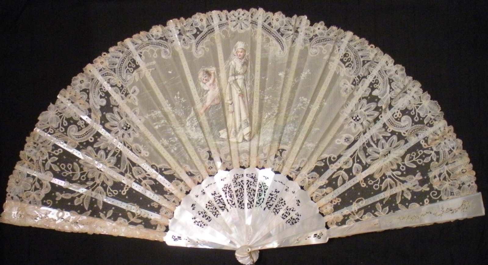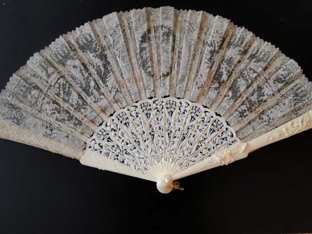 Comments: The fan leaf is Brussels application on machine net, and I can’t tell if the center area is cut out for the painting or not. But it is quite nicely done and comes with a Tiffany box. Slight discoloration to the lace, little damage to a stick, but overall very good condition.