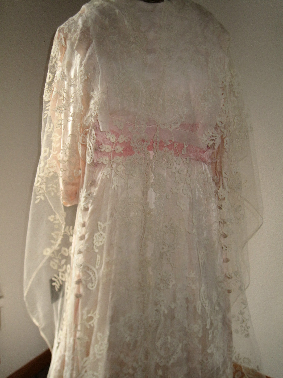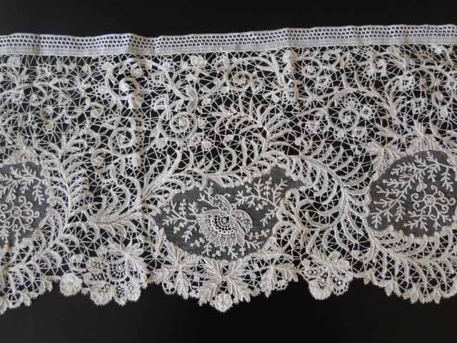 Comments: A wide flounce of bobbinlace applique on machine net, but seems Belgian, especially given the needlelace fillings.  Good spacing of the design, but no additional work like esprits in the upper net.  Condition looks very good, seller cites only two pinholes.  Hard to tell too much given the light background in the photos.