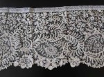 Comments: A Brussels Duchesse border, medium width, although rather short.An interesting desing of small motifs with thin leaves, and note the use of fillings in the bobbinlace motifs as well as in the Point de Gaze cartouches.  Very good condition, wish there were more.