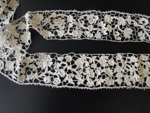 Comments: Raised Venetian lace of this small scale is sometimes known as Rosepoint in contrast to the larger Gros Point. The flow of the design looks intact in some parts, but disjoint especialy toward the ends. Most of these laces were reworked from earlier peices, and this doesn’t seem to be an exception. Still, it is a good example and I see some well-done sculpted raised borders.