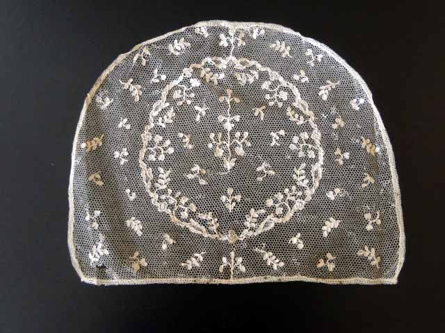 Comments: A capback, later 18th to early 19th c, of a type know as Argentan, although it was also made in Alençon. Probably a bride tortilée ground. Condition is quite good for its age, just a few small holes along the lower edge, and some pulls in the ground throughout. Hard to tell if there are any repairs. A nice example.