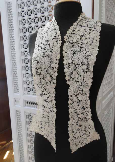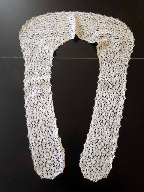 Comments: A shaped long collar of Duchesse de Bruges. Note the small motif around the neck edge.  Very good condition, seller cites one minor opening that I can’t find. Looks almost unused.