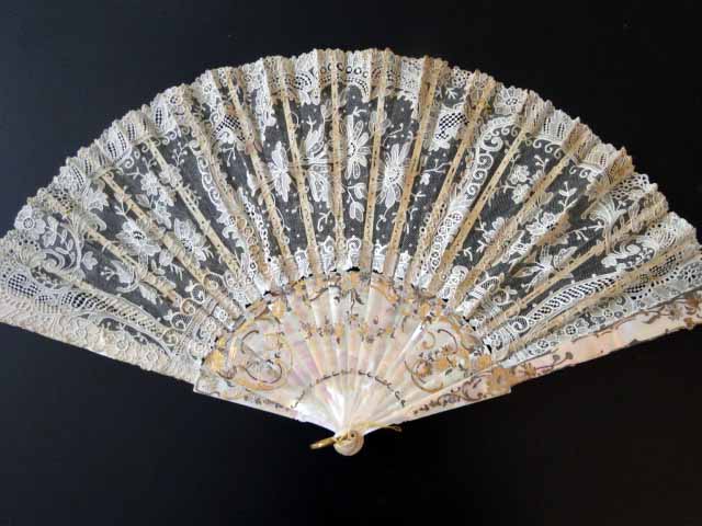 Comments: Another fan retailed by Tiffany, with box.  Point de Gaze leaf, no raised work, plenty of good fillings. Nicely painted MOP sticks.  Overall this is a good quality lace and works quite well in the fan setting.  I don’t see any obvious condition issues from the photos.