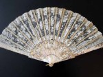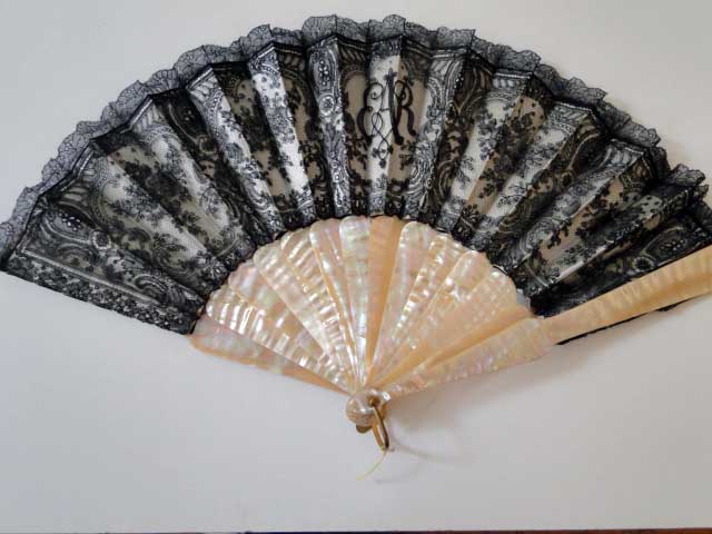 Comments: A Chantilly fan with rather plain MOP sticks that are a bit jarring to the overall look of the piece.  Interewsting initials in the lace which is rather finely worked. I don’t see any obvious condition problems.