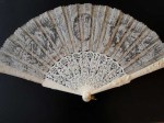 Comments: Another Point de Gaze fan, densely patterned, no raised work, very good work overall. Not as many fillings as the last one, but it’s made up for by the intricate pattern.  Sicks are beautifully carved, and almost compete with the lace in complexity. Lace is somewhat stained, but I don’t see any obvious damage.