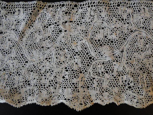 Comments: A narrow border of Honiton, snails/slugs design. The work is a little loose, design rather plain, but the length is extraordinary.  Condition is also very good, seller cites only one small discoloration.