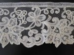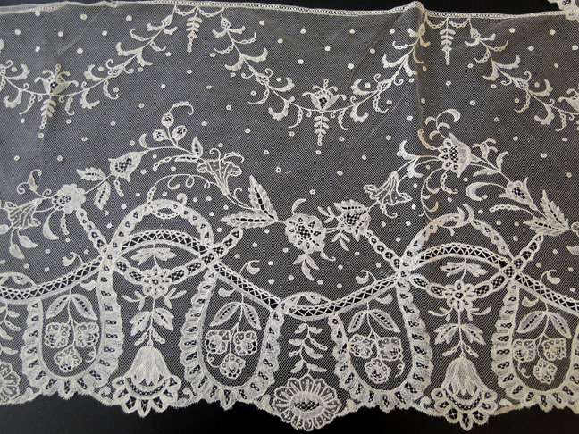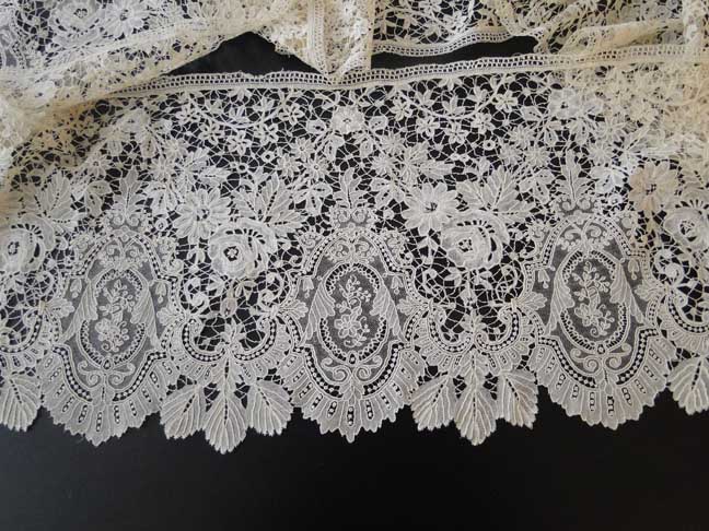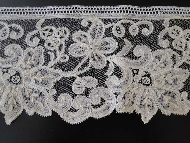 Comments: A good, collectible border of Duchesse de Bruxelles; the design definitely above average. This is a high end market piece. I like the work on the bobbinlace, especially the nice rose design. The point de gaze inserts are flat with some unusual rings forming an oval, and note how they go down all they way to the edge of the piece, mirroring the bobbinlace leaf designs. The needlelace design is a bit plain, but it is well designed to blend in perfectly with the lower part of the flounce. Very good condition, I don’t see any problems from the photos.