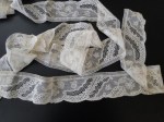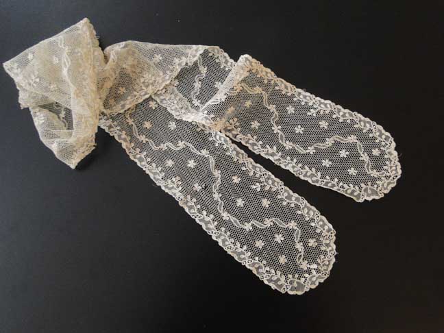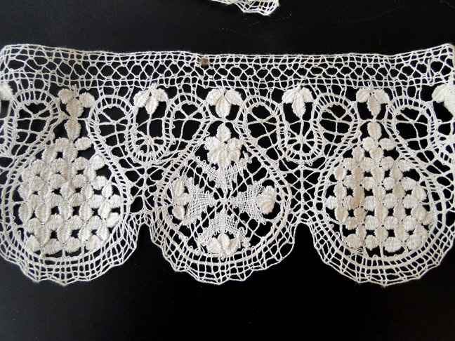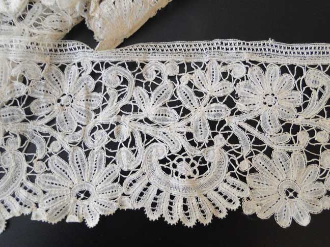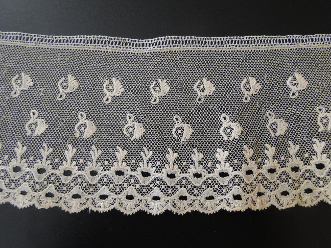 Comments: A Mechlin (I’ll assume Mechlin, closeups aren’t good enough to see the ground stitch) border. Could also be a Beveran or Lille piece. I like the style, and it has a bit of an uneven texture, typical of older laces made of linen thread. Seem to be scattered weaknesses in the ground, part of that is just due to the uneven quality of the thread. Overall good condition, no major holes that I can see.