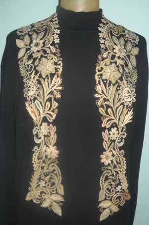 Comments: A Jesurum Polychrome bobbinlace shawl collar, 4th quarter 19th c, of the same design as the one in the Special Ebay Alert posted October 11, 2010 http://tinyurl.com/ckswr6k. The colors are different and this one has brides worked in black, which gives it a more open appearance than the earlier one. It’s quite an instructive exercise to compare the two. The earlier one is more in-your-face, this one is subtler. The condition looks very good, although the black brides on the black manikin are hard to see.