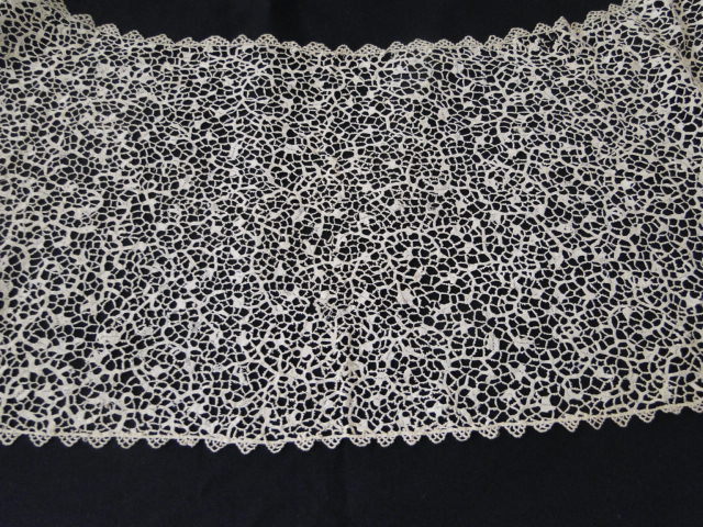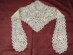 Comments: A narrow rectangular scarf of bobbinlace , nicely done motifs. The design isn’t really typical of Duchesse, so I’m thinking maybe Ghent? Could also be a better quality Bruges. Whatever, I like the design, and the use of the bobbin-made fillings. Seller cites a few small openings, overall very good condition.