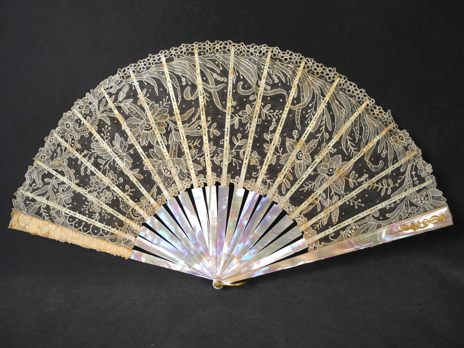 Comments: A Point de Gaze fan with MOP sticks. Quite an interesting design in the lace with the drooping leaves along the top, with a little frill of flowers at the upper edge. The lace is flat with a few needlemade modes for a small amount of relief. Interesting. Note the monogram on the guard stick, which also brings it up a notch in quality. I don’t see any break s in the lace, but it is quite stained.