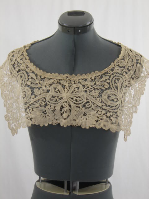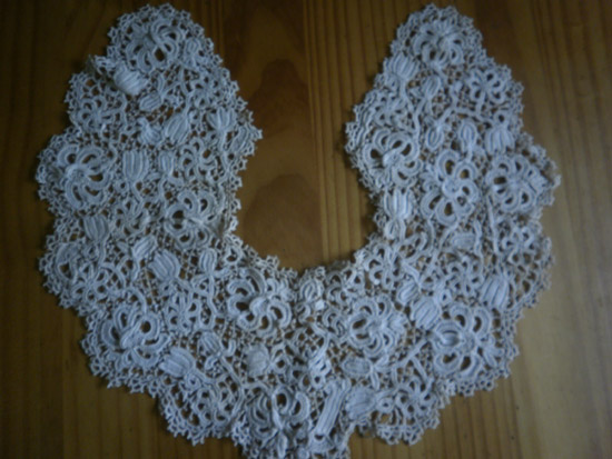 Comments: Irish crochet collar – there seem to be looped picots in the ground. The motifs are tightly worked and nicely reminiscent of Gros Point. Good raised work. The design is a little thrown together, no left right symmetry, but somehow it works nicely. Overall condition is very good from the photos, maybe a little browning, and I see one loose thread on a neckline loop.