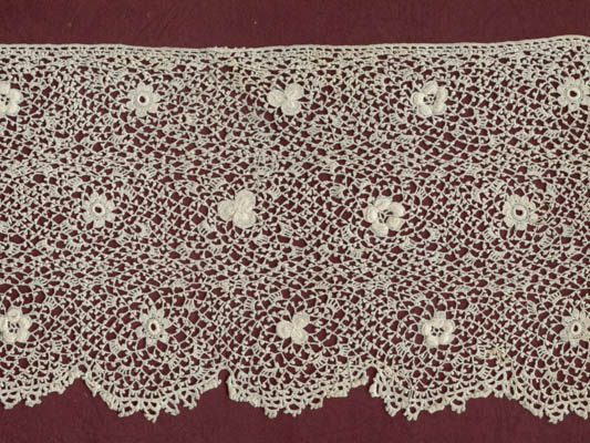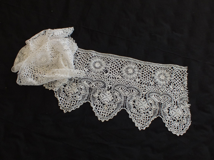 Comments: A Maltese flounce, fairly wide. I like the very large Maltese cross, and the fine, consistent technique throughout. Nice design, appropriate for a border like this. Seller notes some black marks in the first 28″, and ocassional broken thread, but overall I think it’s in very good condition.