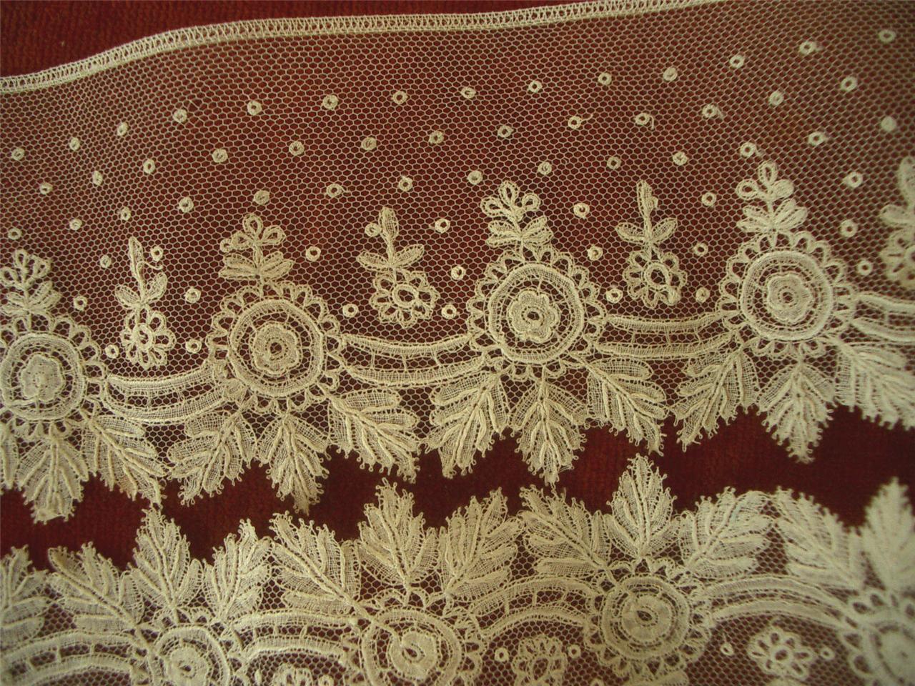 Comments: Wish there were more of this. Brussels application on machine net. The esprits in the ground are needle-made, the rest is all bobbinlace applique. Nice delicate motifs well executed. Condition looks very good – seller cites age discoloration and a few pinhole breaks.
