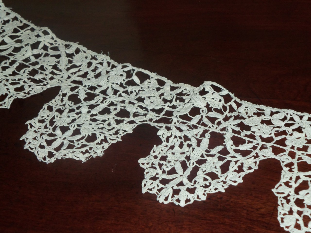 Comments: What I generally look for in identifying 18th c Devon laces are large filling areas but not a lot of variety in the fillings themselves, motifs that look like they might have been worked for a long time thus losing some sharpness and evolving into a more serpentine technique. Also certain technical details in the raised work, and a ground that often conforms to the motifs rather than the perfect straightness of Belgian laces. I think this is a good candidate for Devon. Very good condition for the age, and I do agree with the seller, there seem to be a join midway. Other very minor defects.