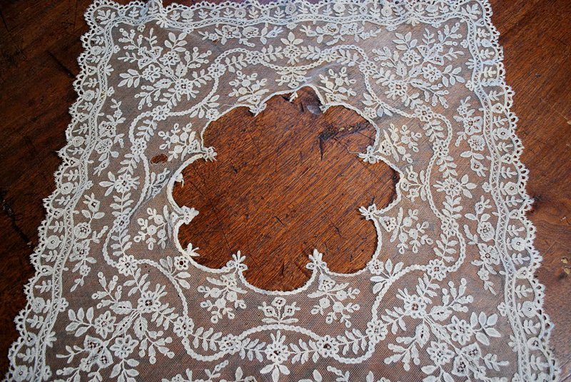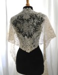 Comments: I’m almost thinking this is in original form – it’s a Brussels bobbinlace with vrai droschel ground. But there are large areas of bobbin fillings, maybe a Devon piece? Aside for a tear along the neckline and a few small holes in the ground, it looks in very good condition. Quite an unusual piece, maybe early 19th c.