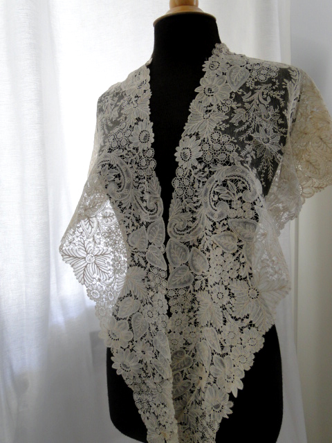 Comments: Duchesse de Bruxelles triangular shawl with very large, well done Point de Gaze inserts. No raised petals, but that’s fine. Note the naturalistic design, and the raised rings decorating the needlelace flowers. The bobbinlace is quite fine with interesting raised elements and naturalistic flowers, all very well done. The condition appears excellent – I see a few minor spots in the photos, nothing serious.