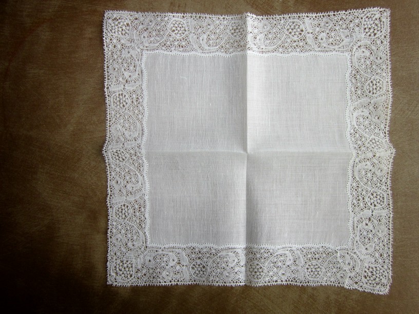 Comments: A later 19th or early 20th c Binche handkerchief – if there were small woven tallies I’d call it Point de Fee. Good snowflake ground. Condition appears very good. There have been quite a number of modern technical books on this kind of lace lately.