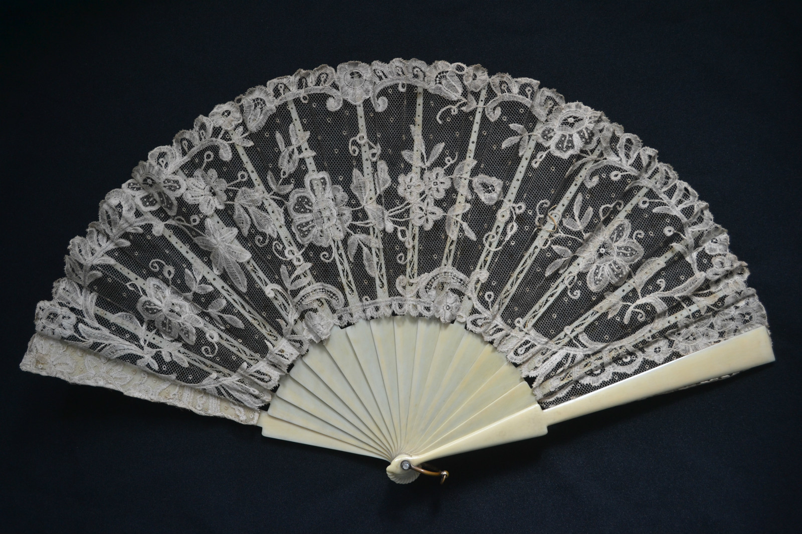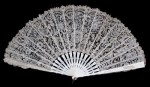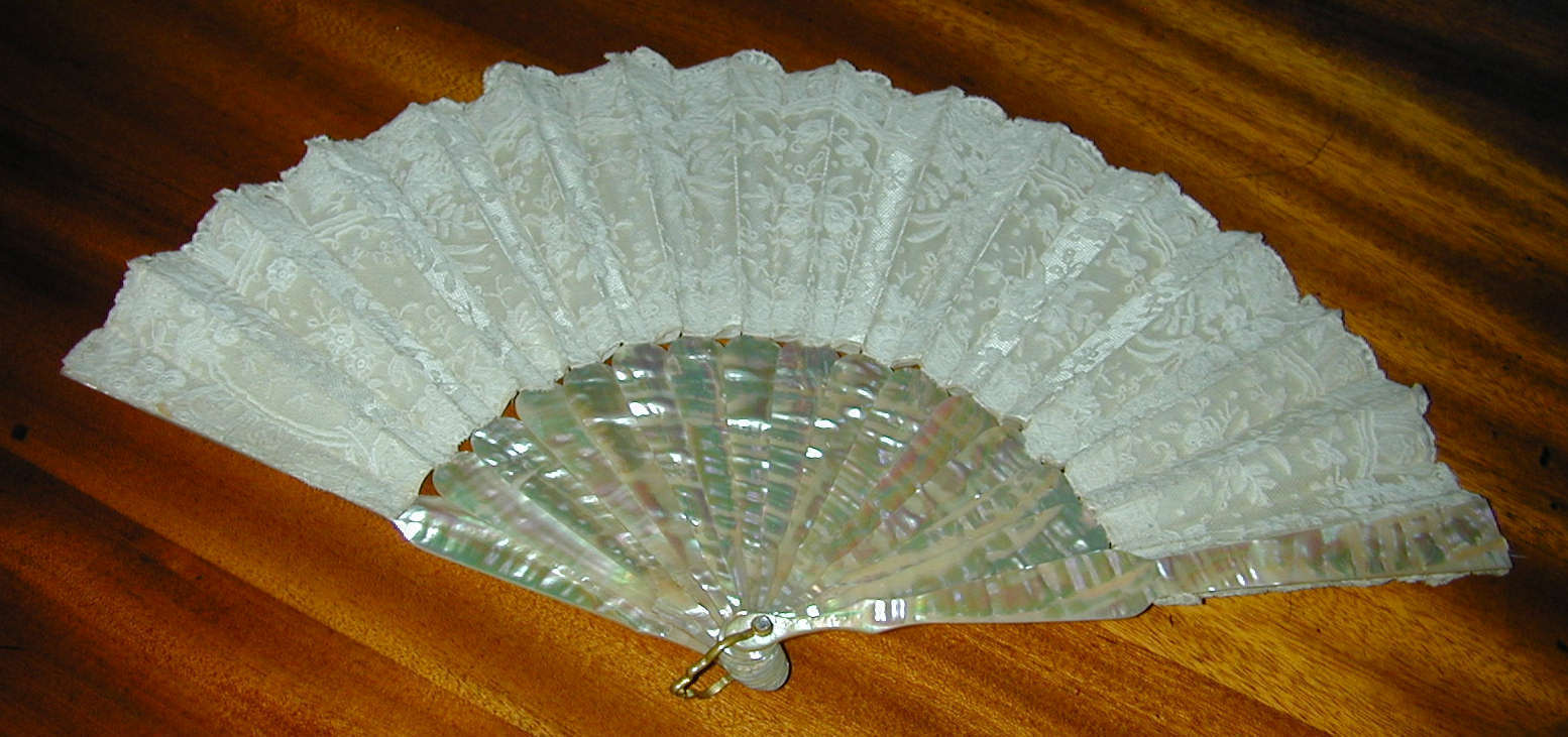 Comments: This fan leaf is rather hard to see, white lace on a light background, and the MOP sticks are a bit overpowering. It looks like Brussels application on machine net, and in very good condition. Maybe some raised rings on the bobbinlace? Not sure if these are later additions.