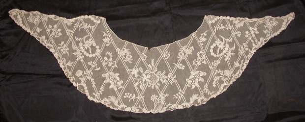 Comments: A Point de Gaze collar, simple raised petal roses. The design is nicely symmetric with a few unusual flowers, but still a rather conventional pattern. The condition looks very good, I don’t see any problems from the photos.