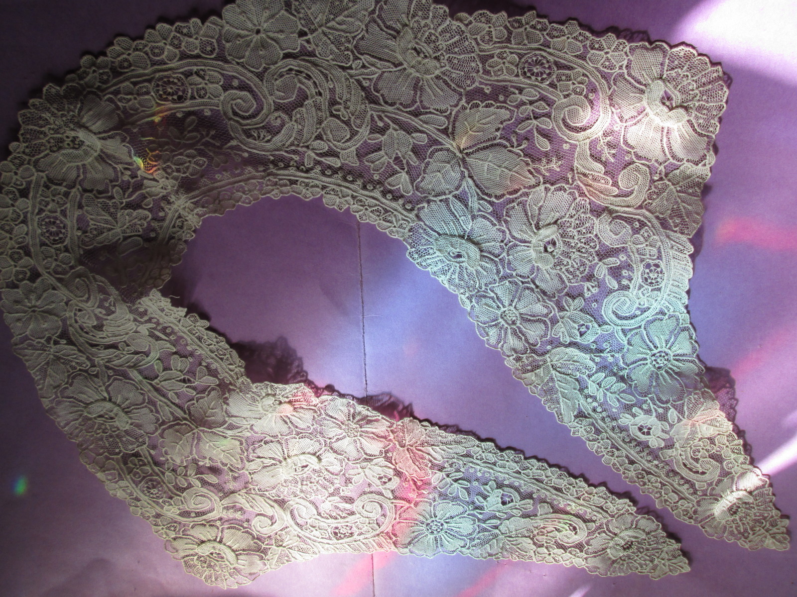 Comments: A Duchesse lappet collar, a bit on the Bruges side. Some small needlelace ring accents in the centers of flowers. Dense standard design, some raised work. A little frayed, some broken brides, overall fairly good condition.