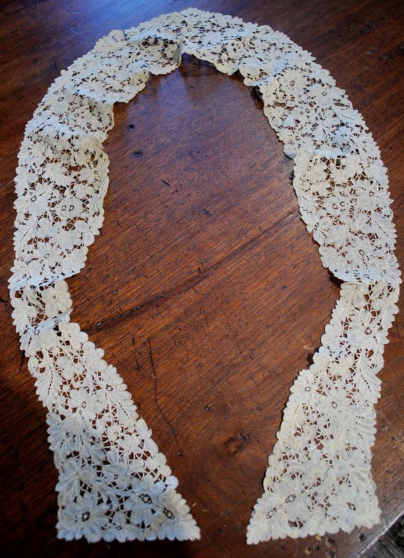 Comments: Several segments of a good Bruges Duchess border. Not too many motifs, but they are naturalistic and well arranged. The condition, aside from the breakup, is very good.