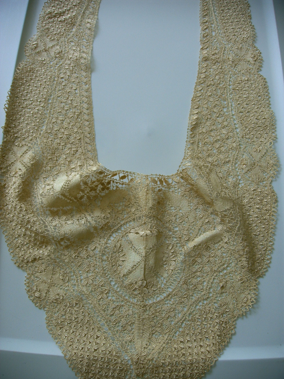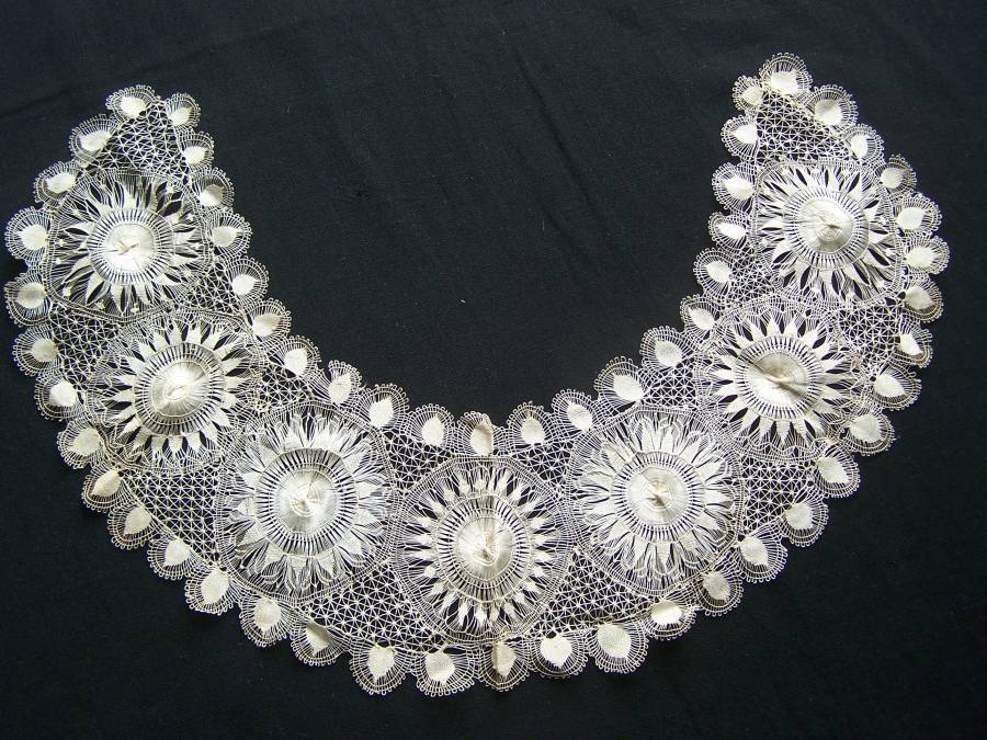 Comments: A collar of ñanduti, and the seller says it is silk. Might be – it does seem to have a certain sheen. It has the complexity of an older piece, but not the really fine thread of the best ones. So it might not be too old. The condition looks very good, and the roundels are varied and interesting.