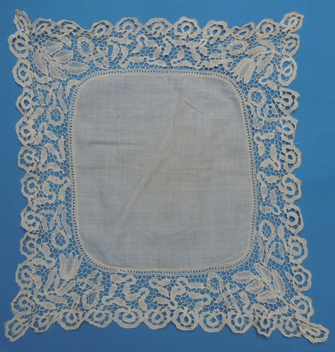 Comments: A Honiton handkerchief, slugs/snails period. The design is rather plain, but I do like the tulips in two corners. Can’t tell if the brides are needle-made. The work is actually quite tight, but condition, although no technical damage to the lace, seems a bit worn. Seller cites a few holes in the center cloth.