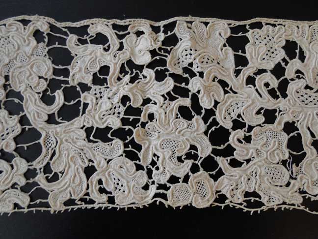 Comments: I’m a little bothered by this piece. It does have the look of Punto in Aria – the flatter kind that sometimes people think comes from Spain, but is perfectly good Italian. But look at the relief – it seems to be just one long wound cord sewn on the pattern with a tacking stitch every once in a while (sort of like what they sometimes did with Miracourt bobbinlace guipure). And look at the backside photo – there’s a lot of woven tape formed into the motifs. I think this is a later 19th c piece, using woven tape with a few needlelace fillings, then the cord was attached as relief later. The brides don’t look particularly old, and normally one expects loops on the lower border, not single picots. I wouldn’t call it old Mezzo Punto, it just doesn’t look up to the quality of the older stuff. Plus, it is very, very long, which would be a remarkable survival. Condition appears very good, which is another unusual thing for a very old piece.