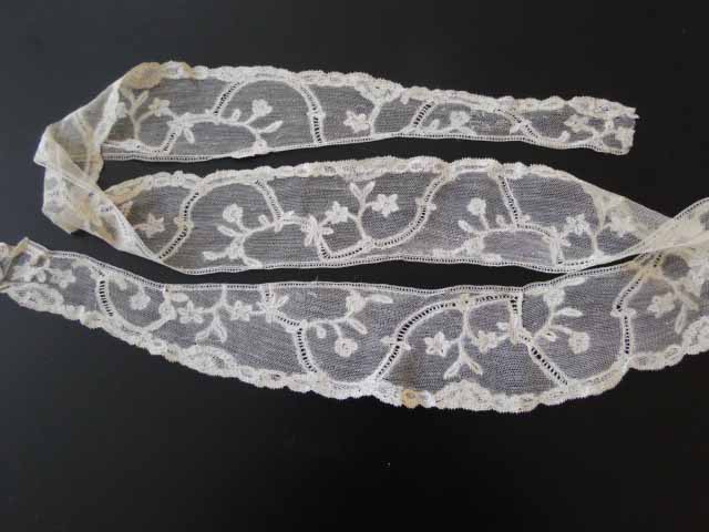 Comments: A good example of the 18th century ‘flat grounded’ needlelace, the best ones were made in Belgium (where even today they are erroneously called ‘point de Venise à Reseau – a term that never in fact existed at the time these were made), or Italian Burano. This has the less sophisticated look of Burano, but these laces were probably also made elsewhere. The pattern looks consistent with a sleeve ruffle – it might have been cut down at the ends, but hard to tell from the photos. It has two joins and some damage at the top, although I’m having a hard time spotting these. I think it looks quite nice.