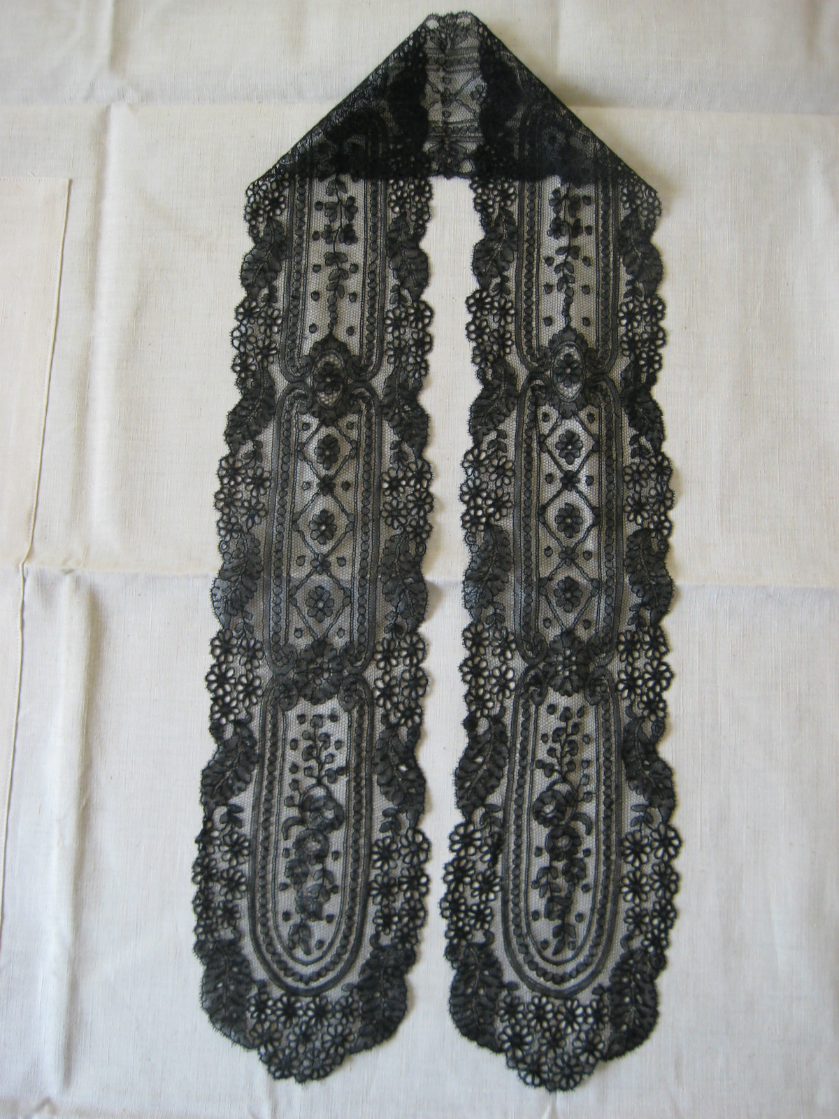 Comments: Chantilly lappet scarf, with a good, vertical design. Note the openwork flower elements, unusual. Some damage at the center join – hard to tell if this is just wear, or the failure of an actual seam. I’m thinking the former, but it is very localized. Given the overall quality and condition of the rest of the piece, I think this is minor.