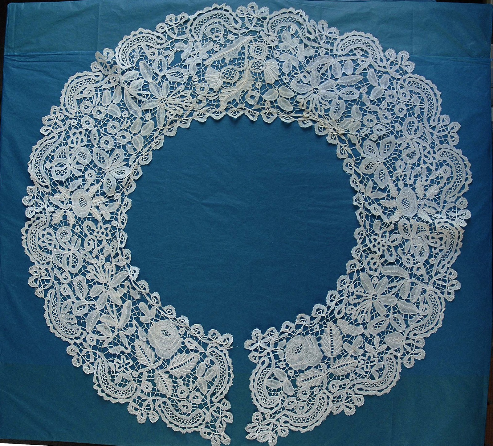 Comments: No dimensions given, but it looks like a fairly large shawl collar of silk Maltese. It’s a little hard to see on the blue background, but there are lots of well done leaf grounds, and some good guipure outside of the central Maltese cross. The condition looks very good, I can’t see anything wrong from the photos.