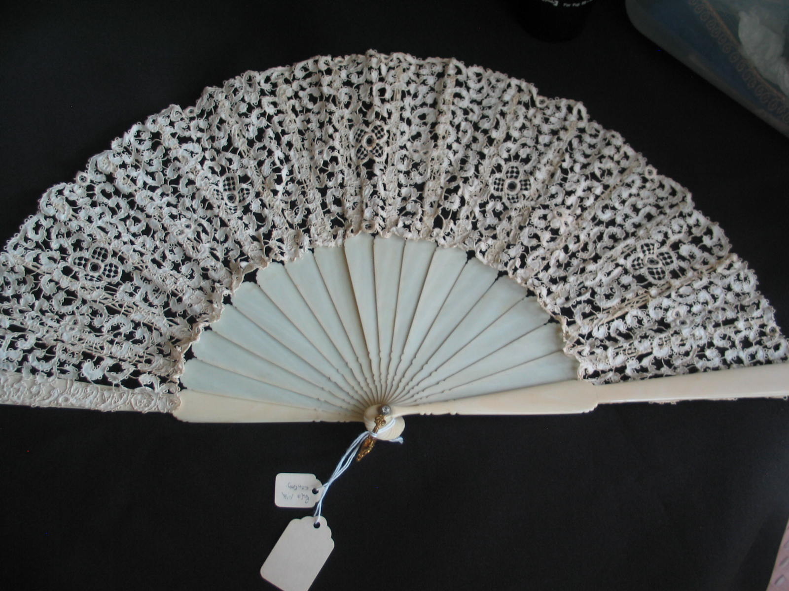 Comments: Keep an eye on this seller over the next few weeks – I was contacted and told that there will be some important pieces listed in the near future. As is already obvious by the quality of the lace fans listed in the past week. This carrickmacross fan also has a box and quite elegant sticks. The lace is a dense and complex guipure. The condition seems good for a fan; seller cites some light foxing and edge wear.