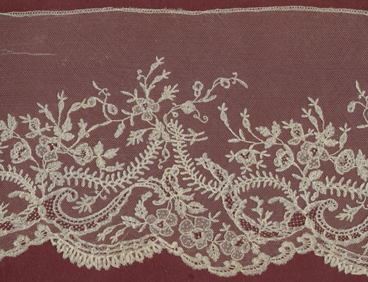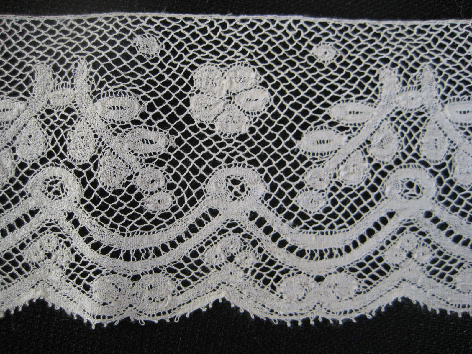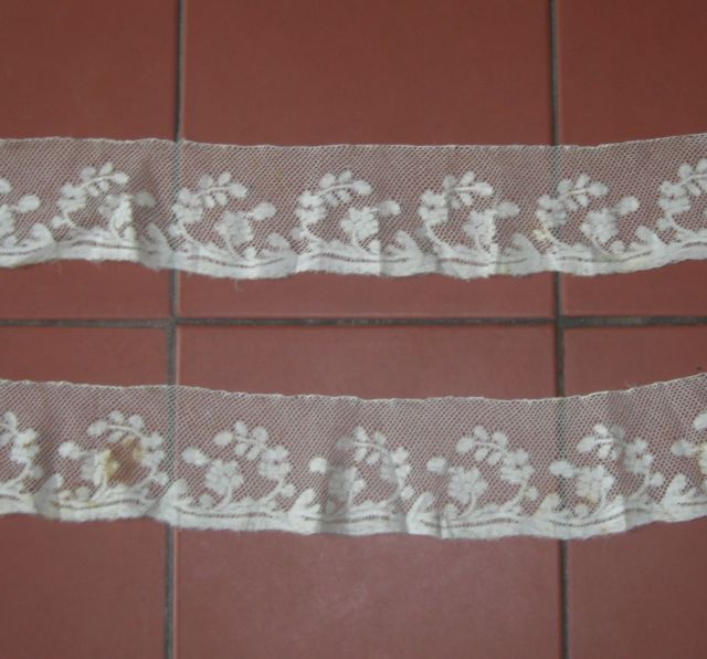 Comments: A flounce of Brussels application on machine net, bobbinlace with a few simple needlelace fillings A middle market product. The length is very good, and the condition of the cotton net looks great, although there aren’t a lot of photos. The design is romantic, but a bit crowded. No esprits in the upper ground.