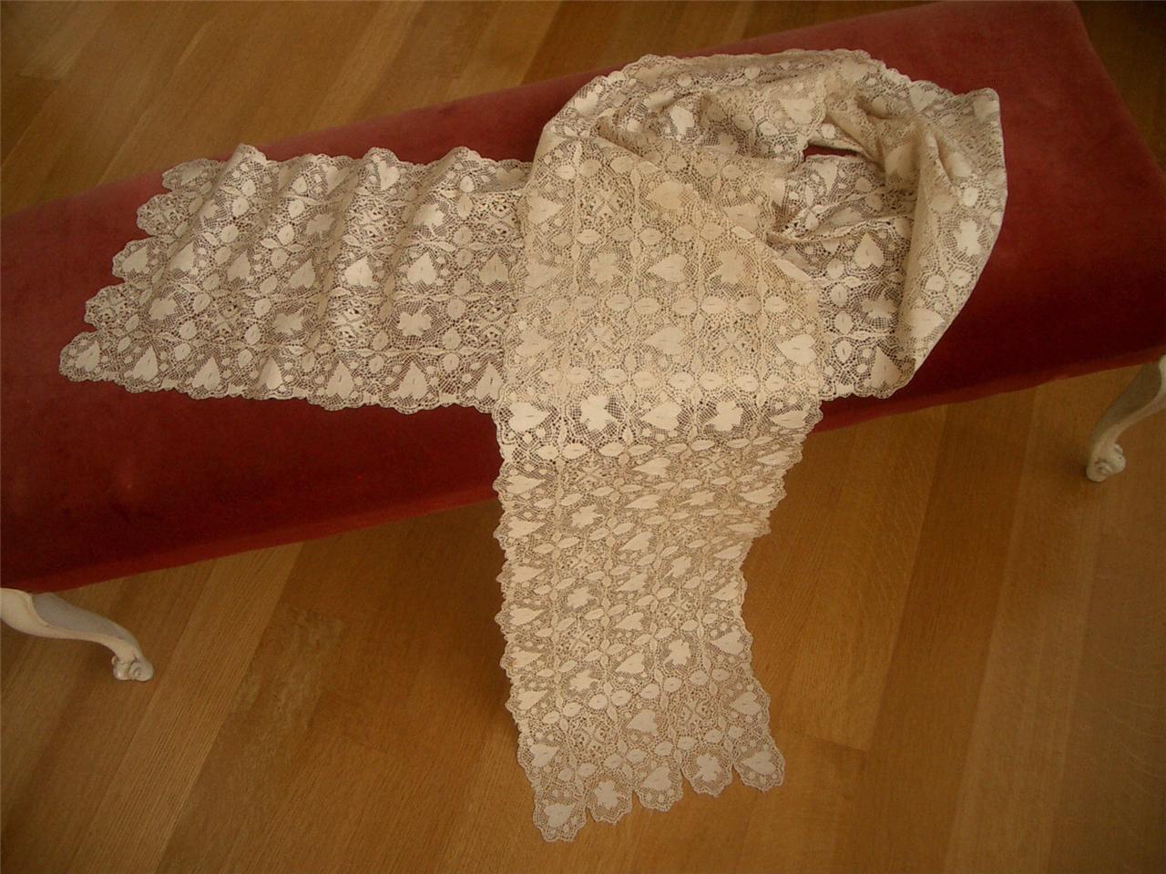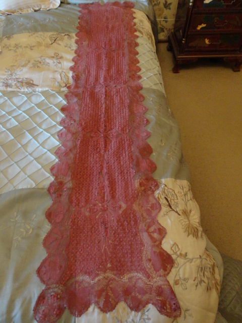 Comments: It’s what, pink? I think it’s a fair scarf as far a Maltese goes, but I’m just hoping it has been dyed. Otherwise it would be a very unusual piece. Good extensive woven leaf background with large guipure areas. Seems in overall good condition, seller doesn’t note any defects. Just wish I could tell what the thread is.