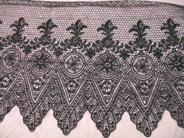 Comments: This seems to be the week for Le Puy guipure. Here is a typical flounce with bold designs on point ground, large guipure areas, and a standard picoted star plaited ground. A little short, but condition appears very good.