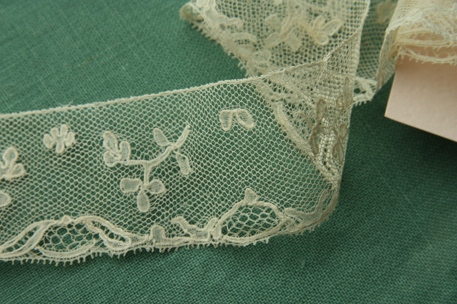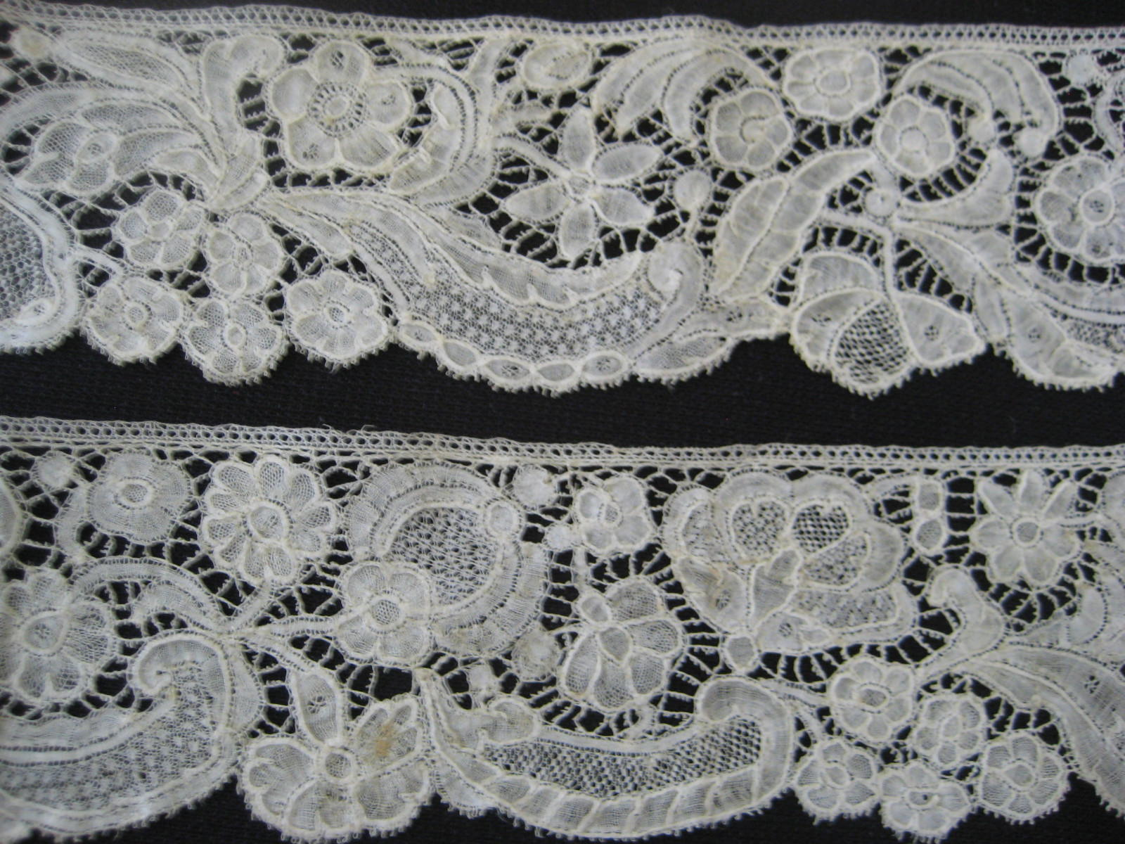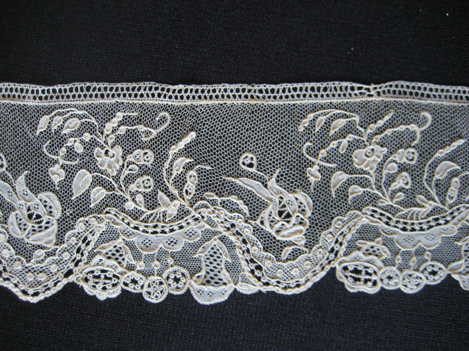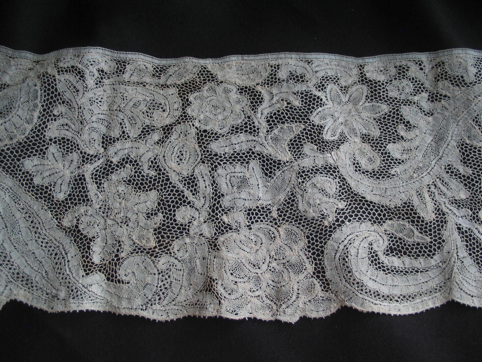 Comments: A narrow border of Brussels bobbinlace with brides, quite beautiful. One seam and one replacement, seller does not specify where along the length these occur. Still, there is enough of the repeat intact to make this an exceptional piece. Condition also appears very good.