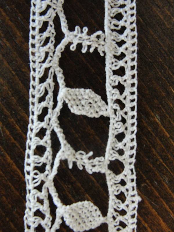 Comments: A really cute knotted needlelace insertion, might be Bibilla or Oya? It seems to be more complex technical than it looks. Condition looks very good, seller cites only one small age spot.