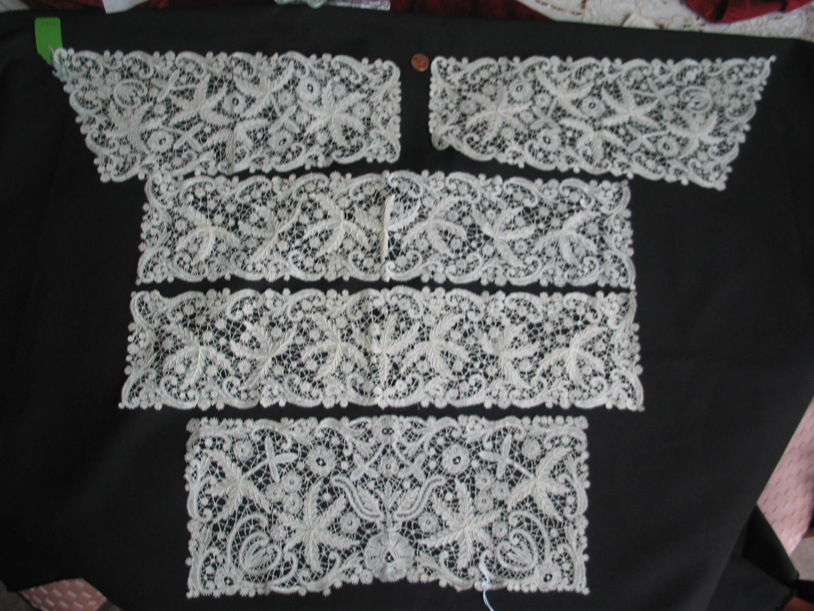 Comments: We must distinguish between the old Duchy of Brabant which contained the great lacemaking centers of Brussels, Mechlin, and Antwerp, with the ‘Brabant’ designation today given to certain coarser Belgian pieced bobbin laces. The latter is more a dealer’s term rather tan a true indication that a lace originated in the Brabant area. It is generally held to be a lace with large motifs with extensive bride and a coarse mesh. This one has no brides, and the mesh is an early plaited variation – not strictly the Brabant ‘definition’, but probably close enough. It is unusually long (but not so much for Brabant), and a bit narrow compared to other examples. I think the design is largely intact, however I’m not too sure about the upper edge. Condition looks good, but there aren’t enough photos to say definitively about the entire length.