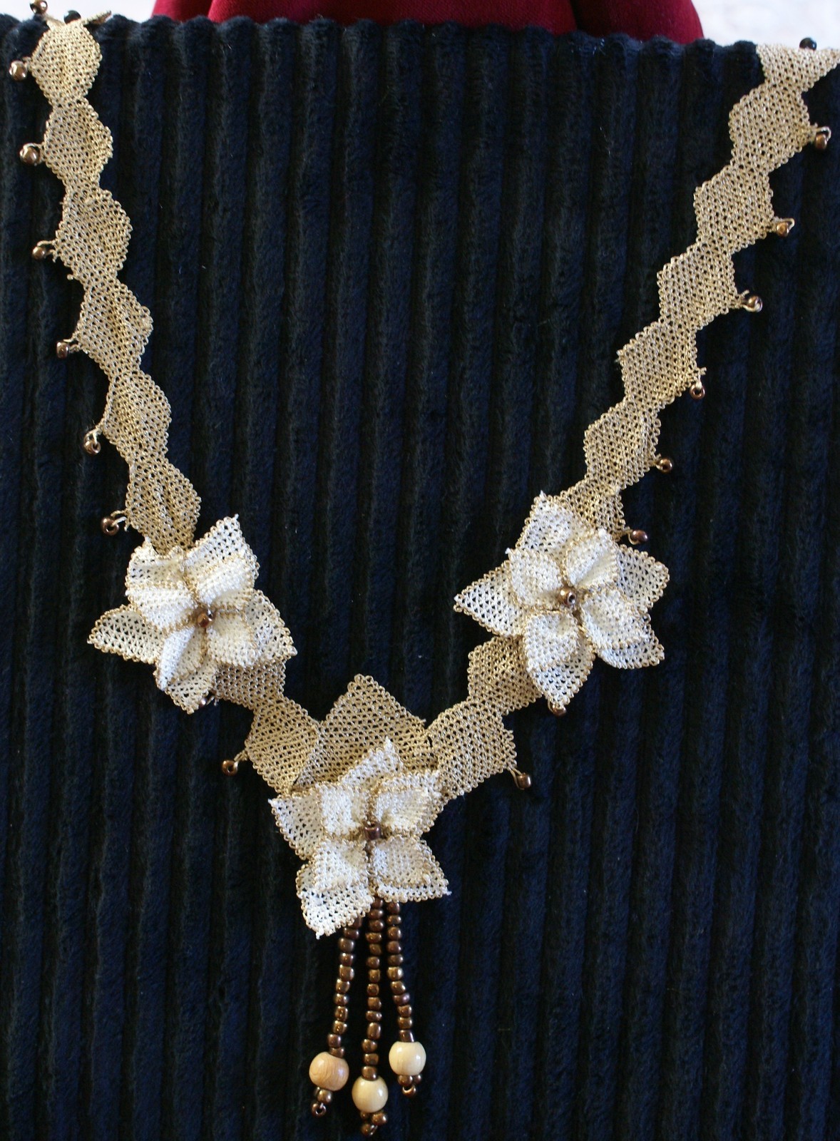 Comments: This seller is listing several other Oya necklaces, and I think they are lovely. The thread appears to be silk, but in almost metallic colors.