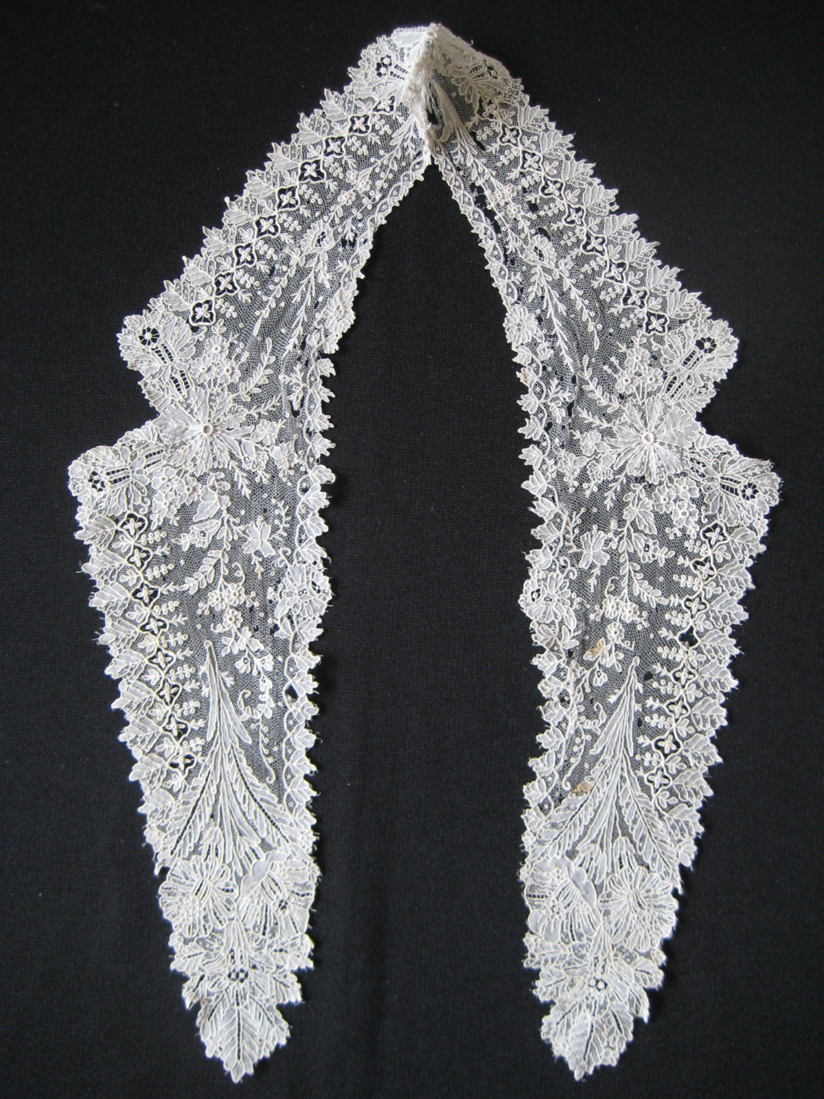 Comments: A Point de Gaze collar, flat work, and the condition is not good. Stains and numerous holes. But what attracted me to it was the picot treatment of the outer edge – the single long picots widely spaced. I’ve seen this before, sign of a better manufacturer. It has an overall good design and some interesting mode fillings along the outer edge.