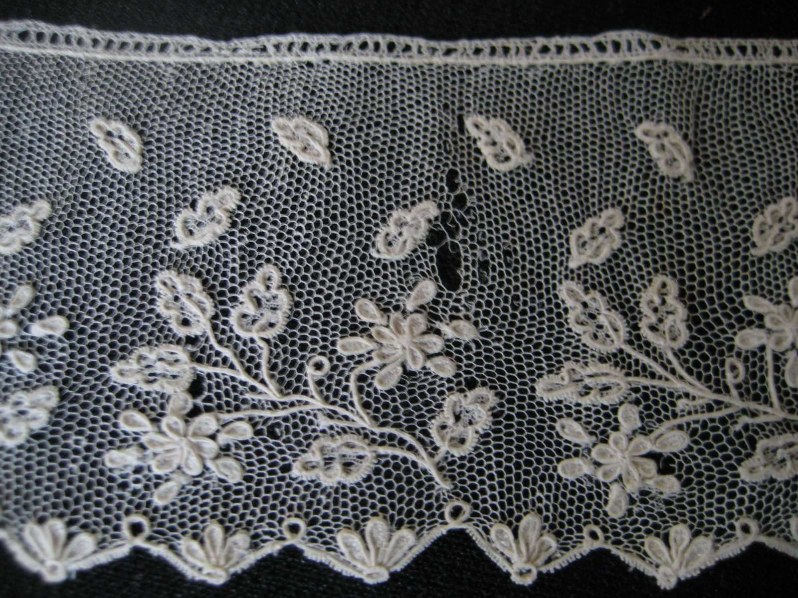 Comments: A very long, wide Valenciennes border, later 19th c, probably Belgian. Good design, but I wish it had a little more flair for a piece of this size. Upper middle market. Condition looks very good from the photos, but for a piece this long, it’s hard to say how good the whole things is.