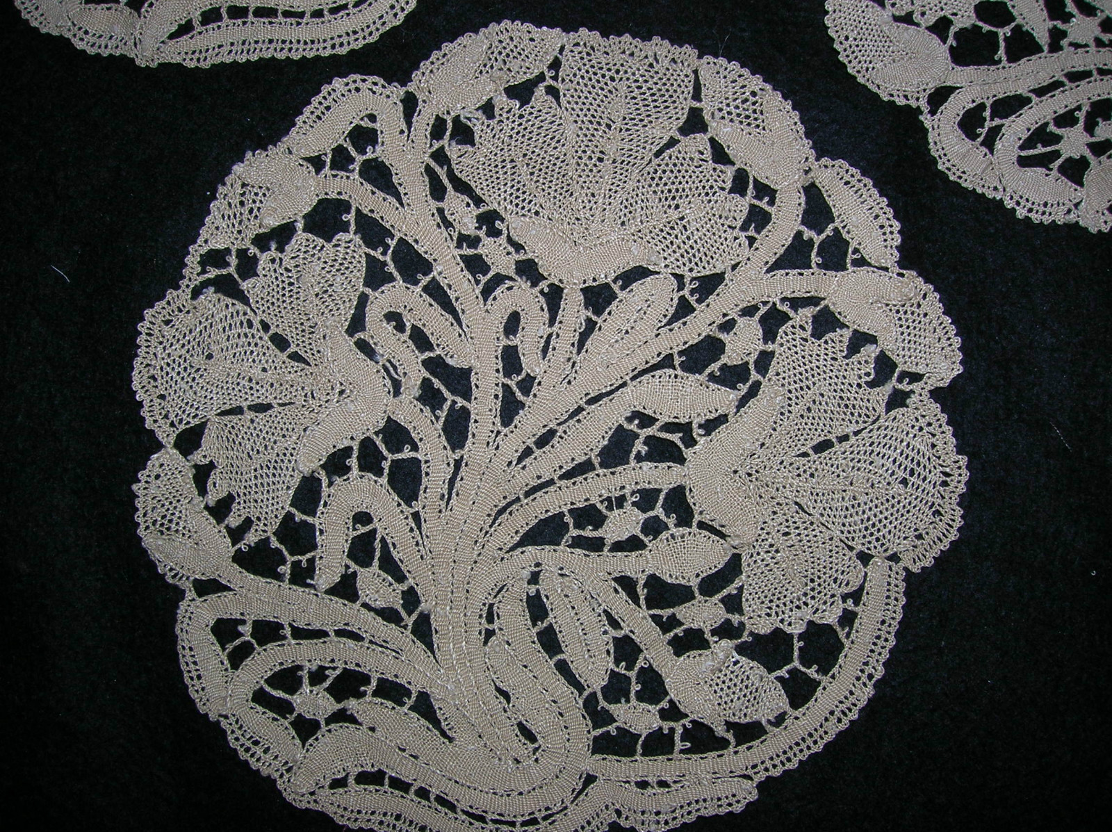 Comments: I was thinking these might be Lepoglava – not really sure, Bruges is a possibility also. But a set of doilies about this size with the floral motif is not unknown in Lepoglava – see http://www.youtube.com/watch?v=JuMHTNeUDrI for some bobbinlace examples. The bride ground isn’t quite right, but maybe… Condition looks very good.