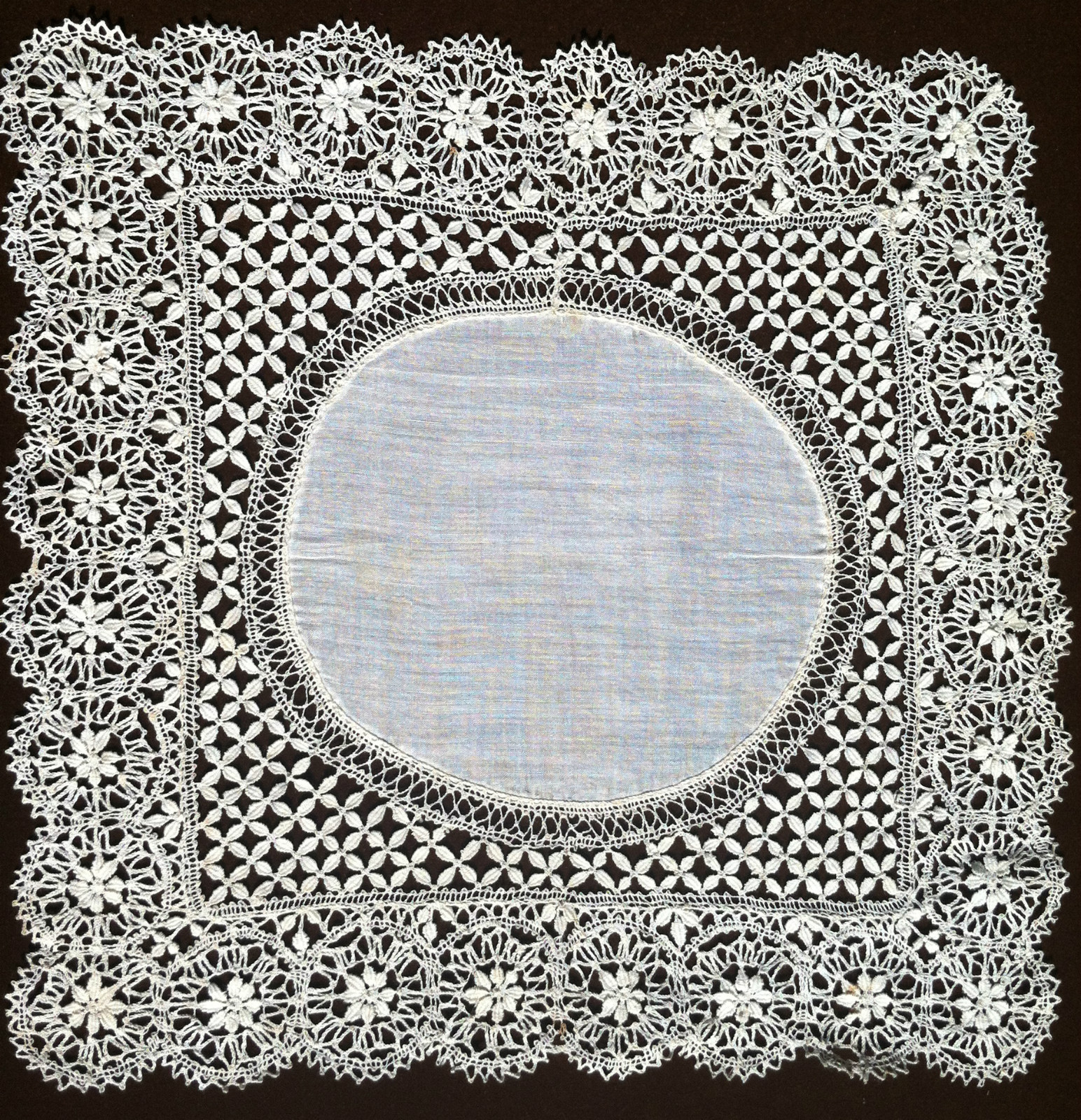 Comments: A densely patterned Maltese handkerchief with good guipure around the outer edges. Note the variation on the Maltese cross around the outside, and the complex ground next to the silk center. Condition appears very good, I can’t see any problems from the photos.