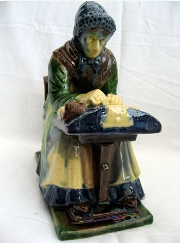 Comments: A Flemish Pottery lacemaker that looks to be in very good condition, from the sole photo. This seller has offered several nice similar pieces in the past. Seller does not cite a maker, but the ‘flame’ glaze might indicate a Brugge piece. The blue on her face was probably a misstep in firing. The brown pincushion on the pillow is unusual. It is also quite a large figure. See the LaceNews collecting post on these figures at http://tinyurl.com/4baktku.